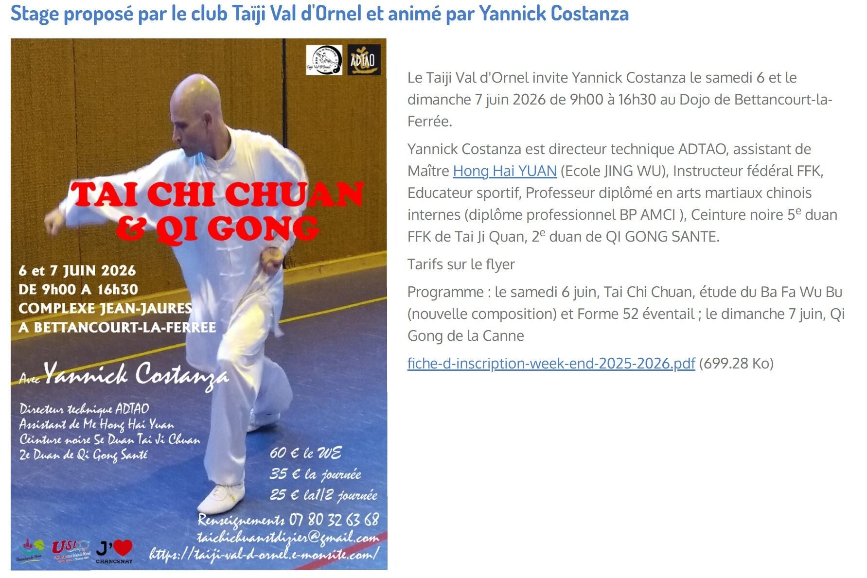 Sur votre site, sous l'onglet "Stages à venir", vous trouverez toutes les propositions qui nous parviennent ainsi que les conditions pour y participer et les formulaires pour s'y inscrire. Ci-dessous, vous trouverez les derniers stages en date. Les flyers disparaissent du site quand les dates sont passées.
